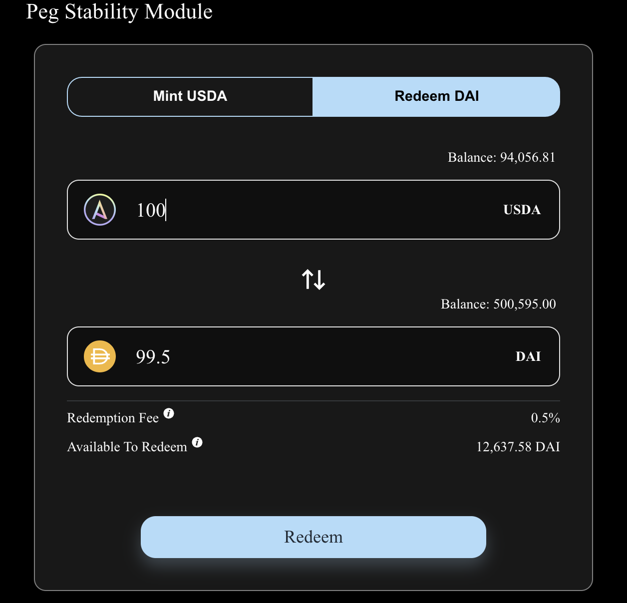 In the example below, the user exchanges 100 USDA for 99.5 DAI since the redemption fee is 0.5%.&#x20;